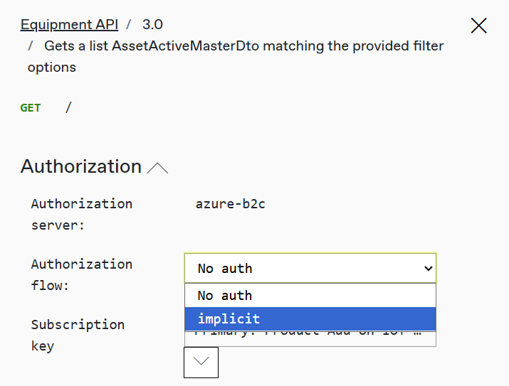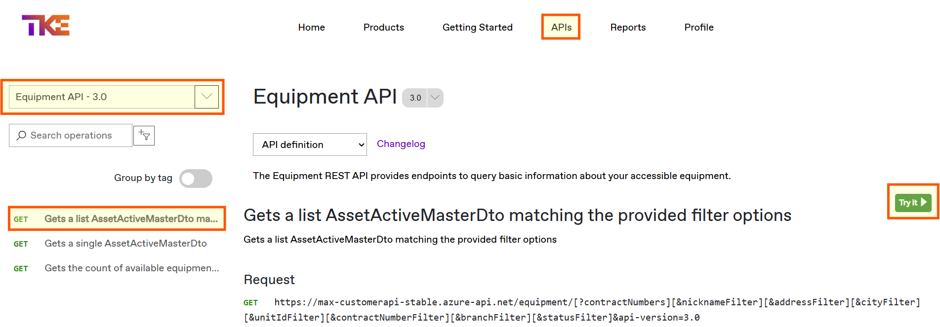To call the Equipment API, select the correct option and then click Gets a list.